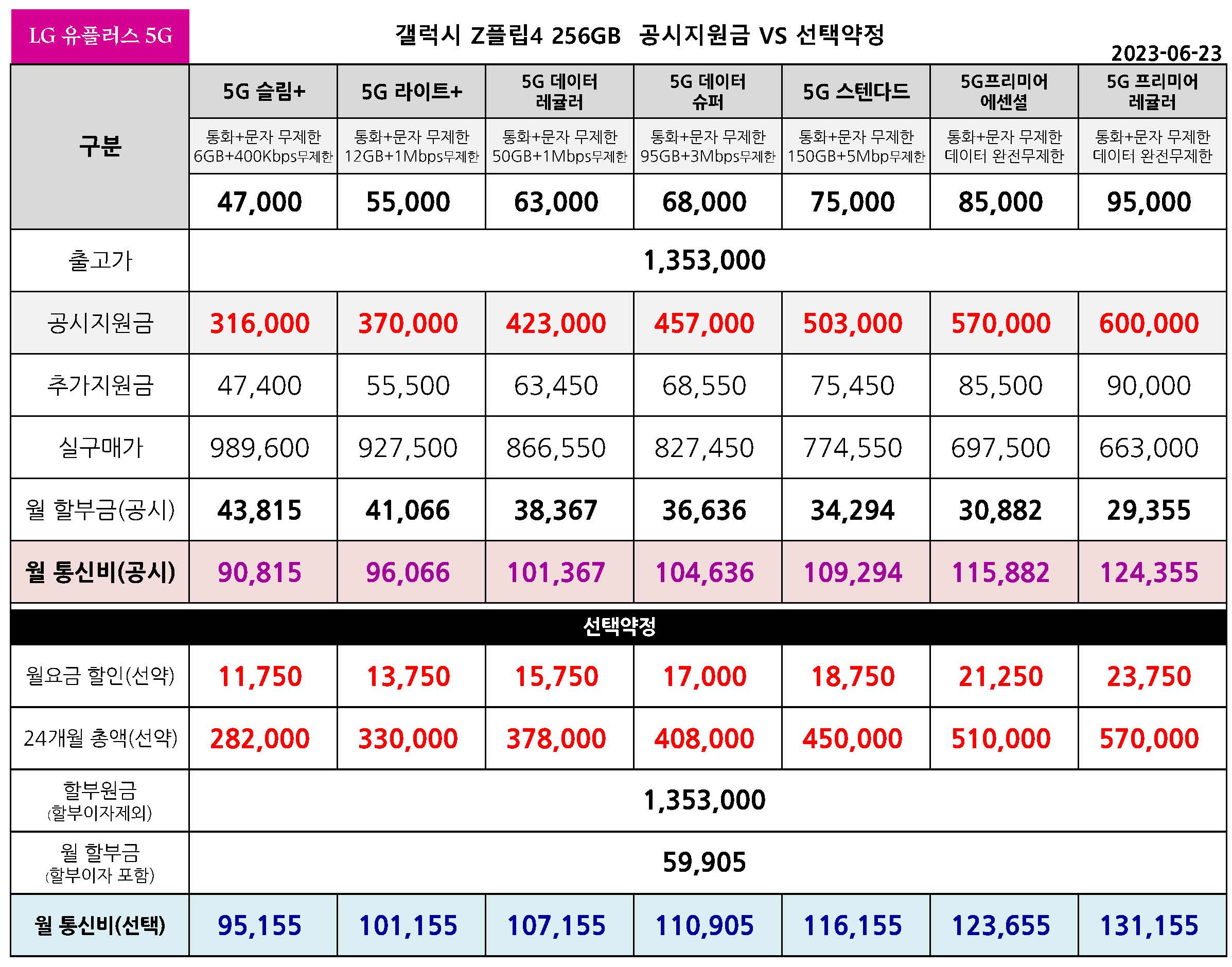 갤럭시 Z 플립4 공시지원금 & 선택약정 월 통신비 요금표 - 6월 23일 기준