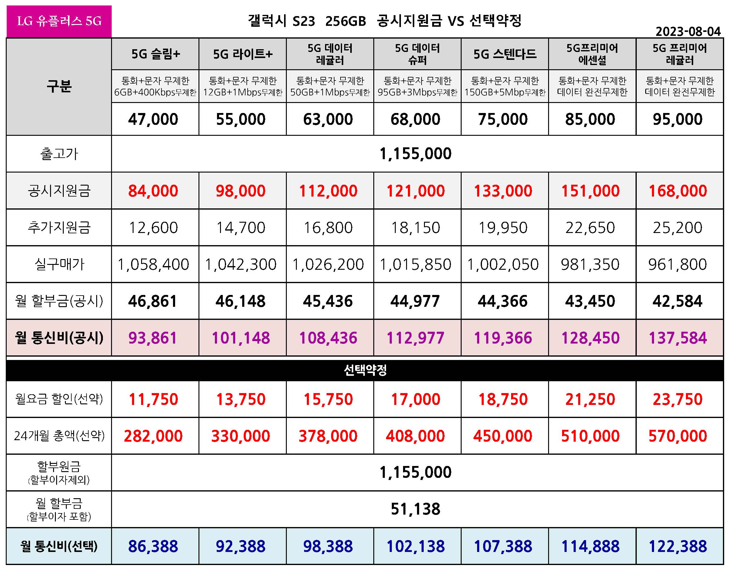 LG 유플러스 갤럭시 S23 256GB/512GB 공시지원금 VS 선택약정 월 통신비