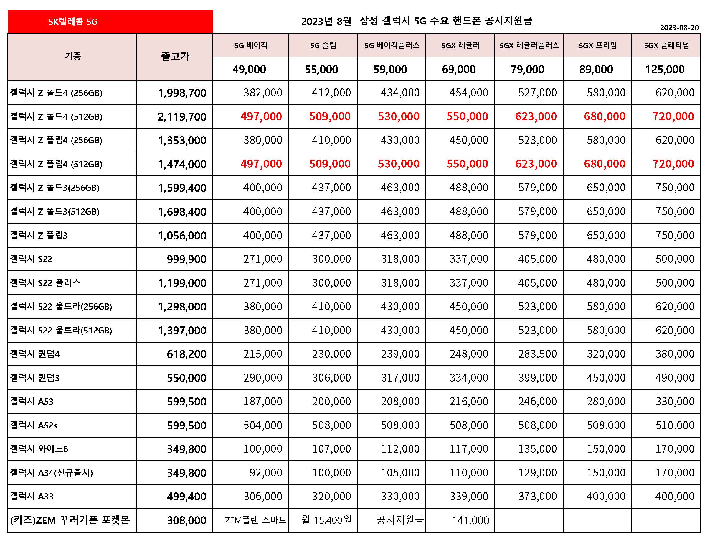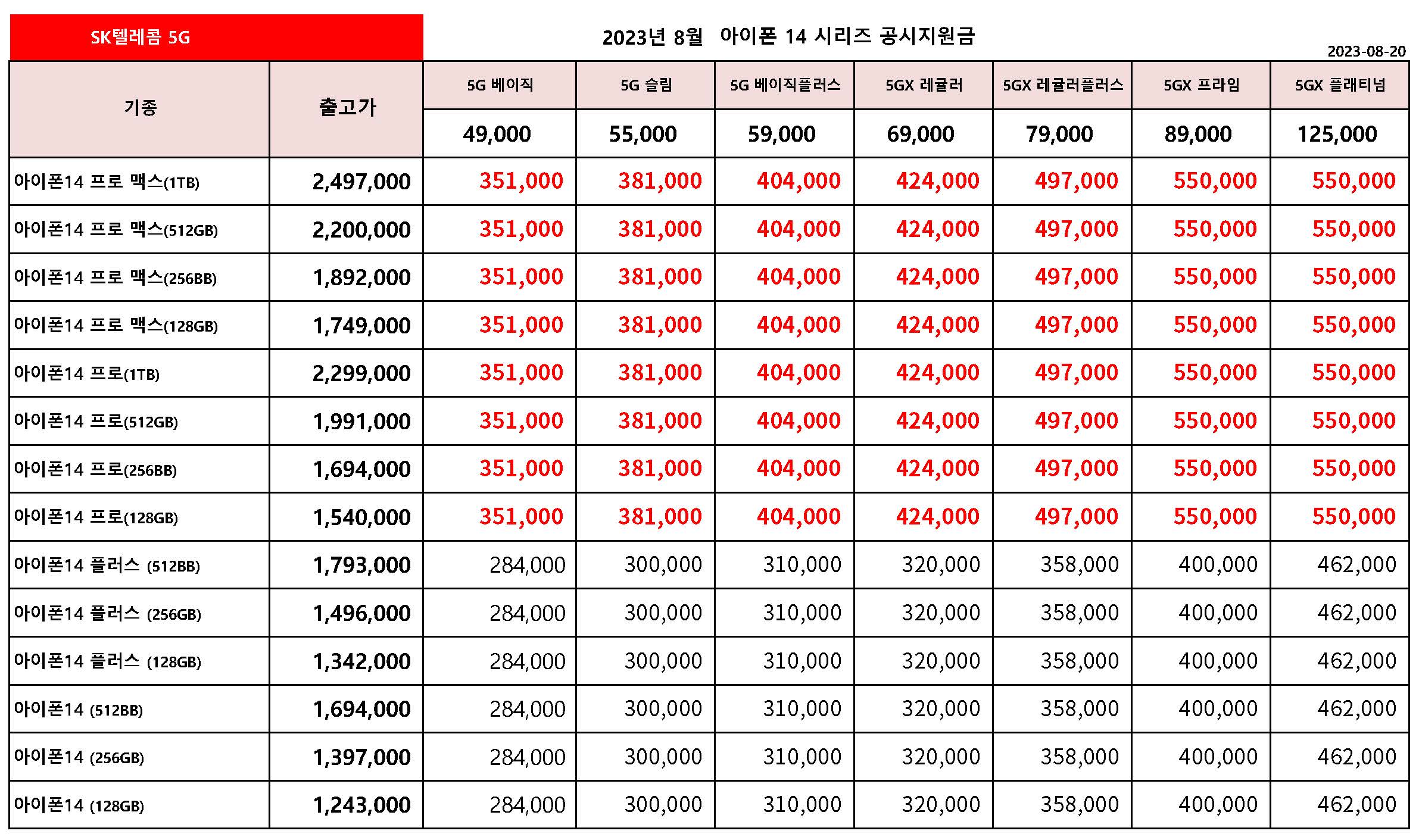 8월 SK텔레콤 주요 핸드폰 공시지원금 정리- 8월 20일 기준