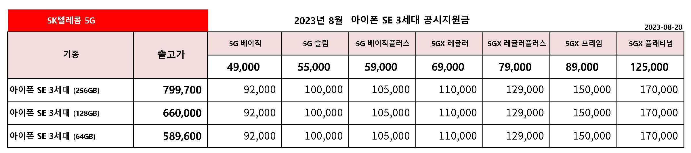 8월 SK텔레콤 아이폰 SE 3세대 공시지원금