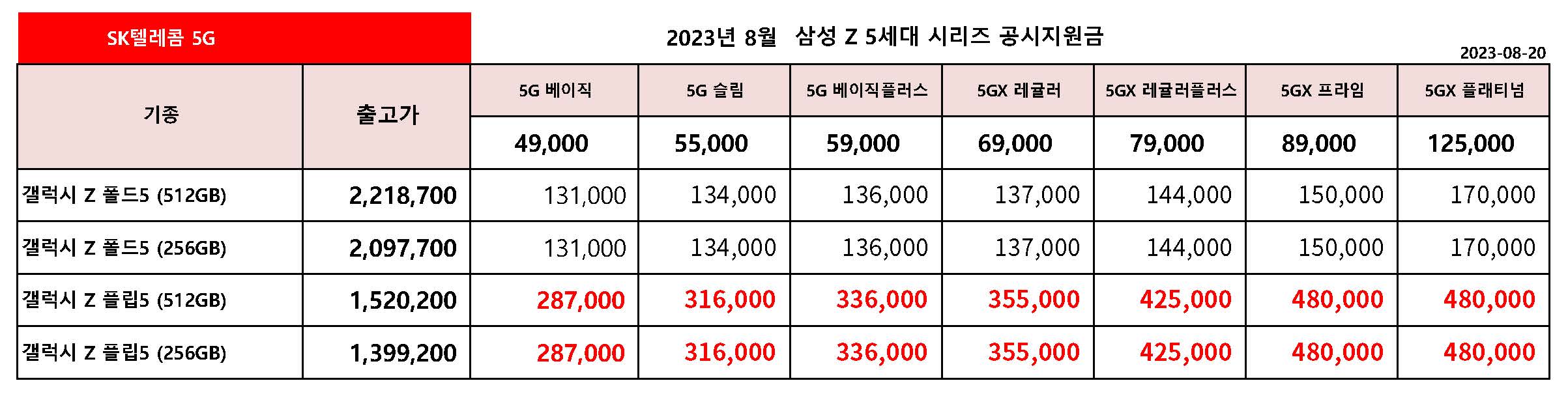 8월 SK텔레콤 갤럭시 Z 폴드5, Z 플립5 공시지원금