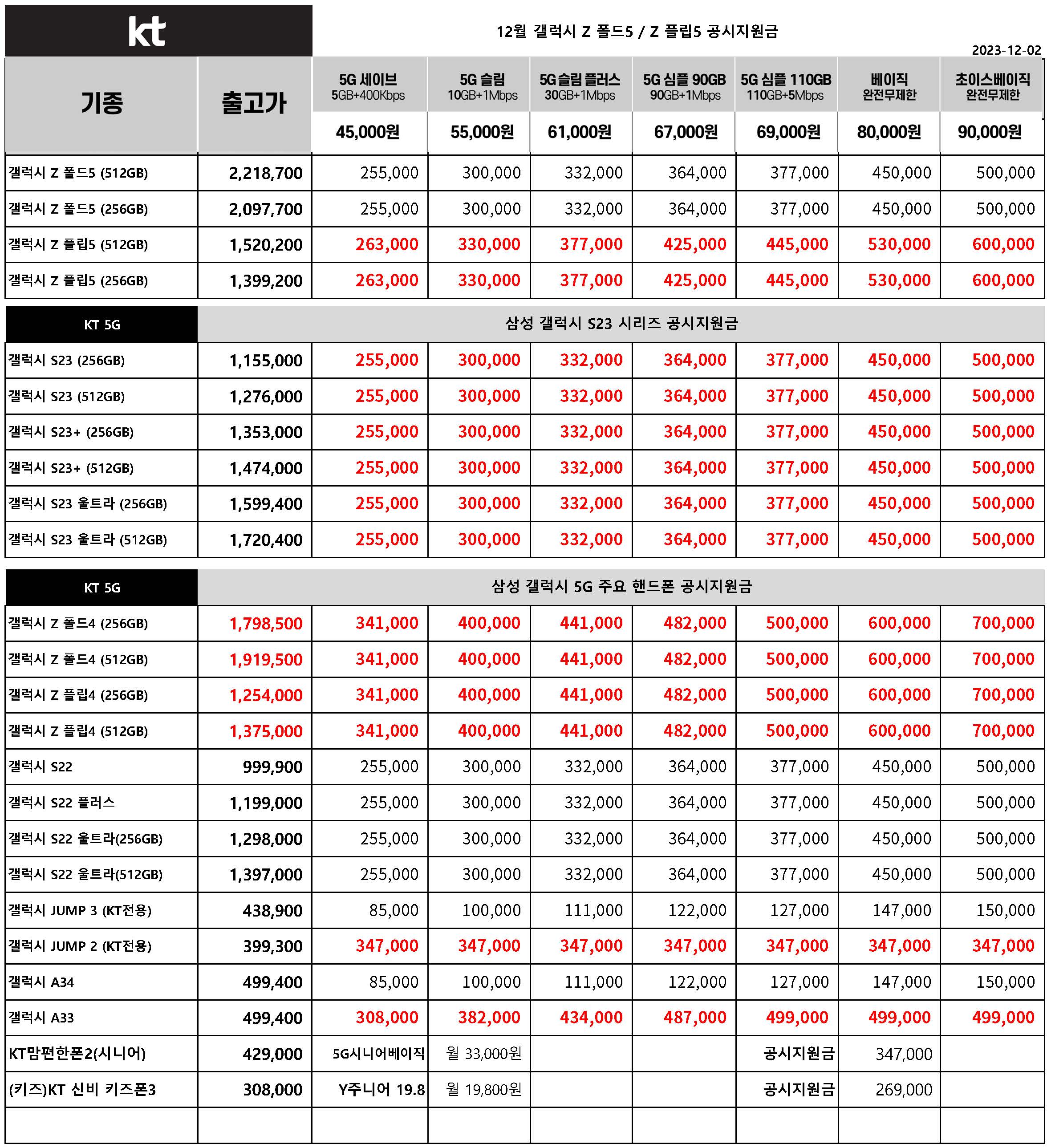 12월 KT 주요 핸드폰 공시지원금 정리 - 12월 2일 기준