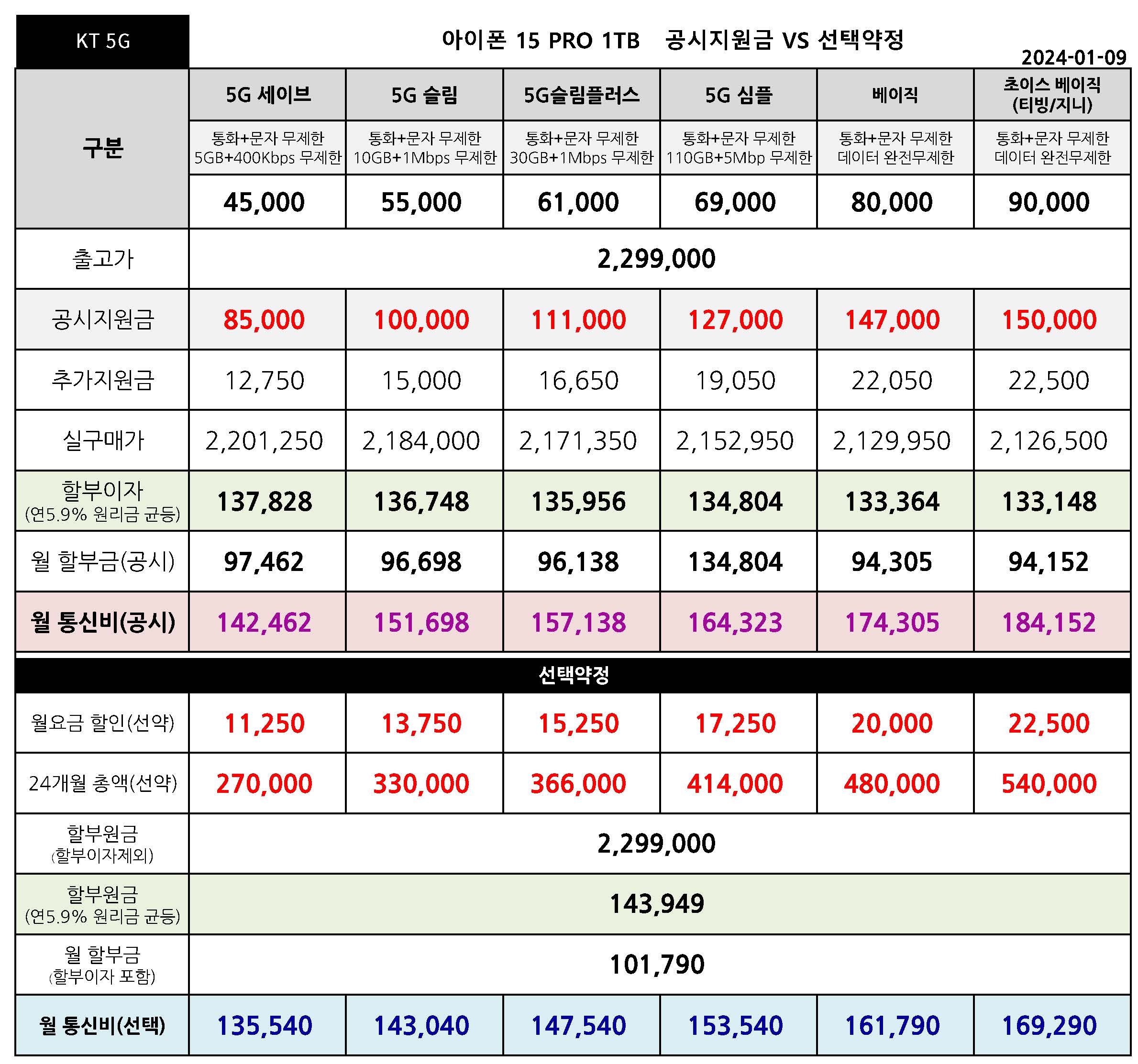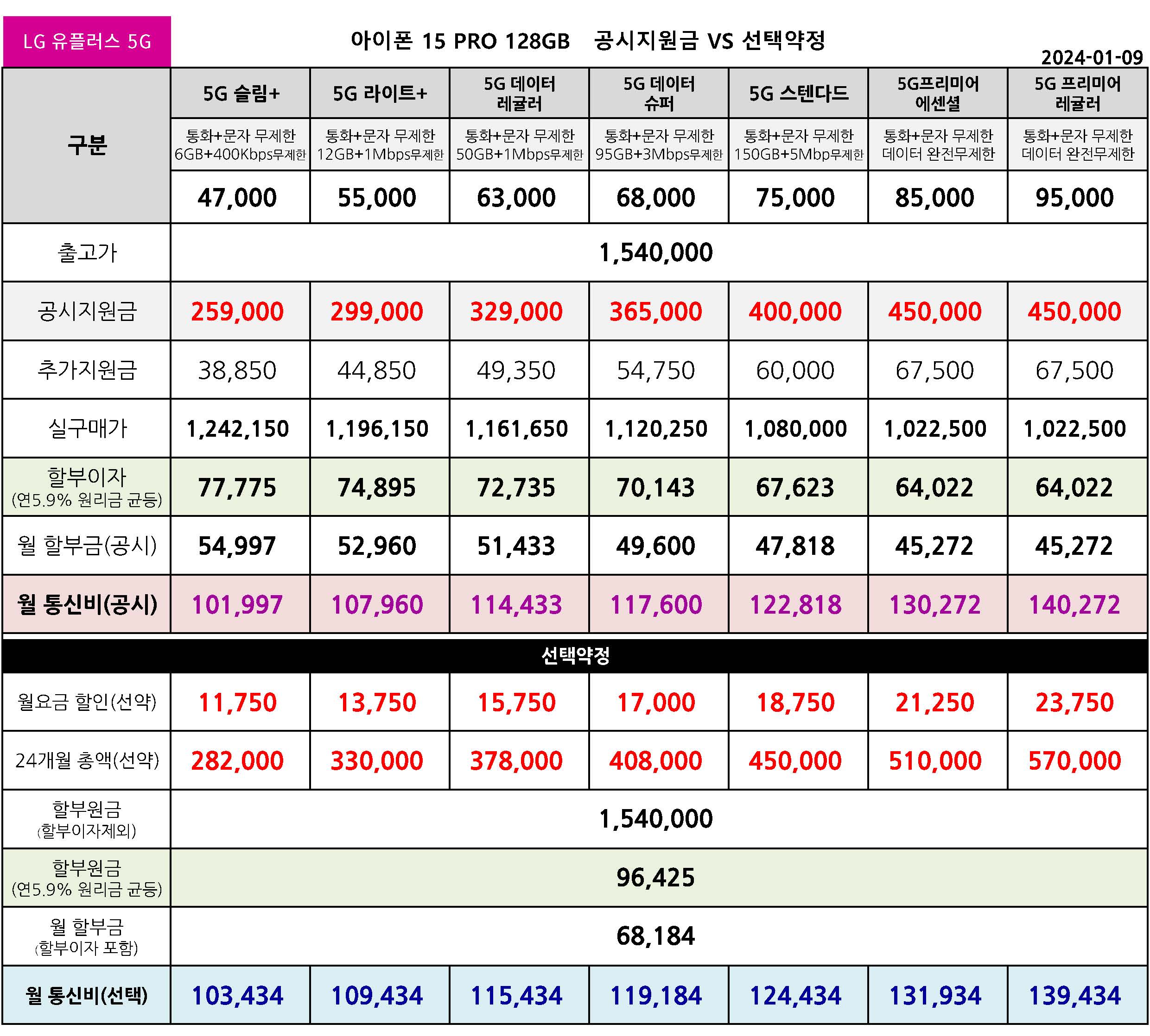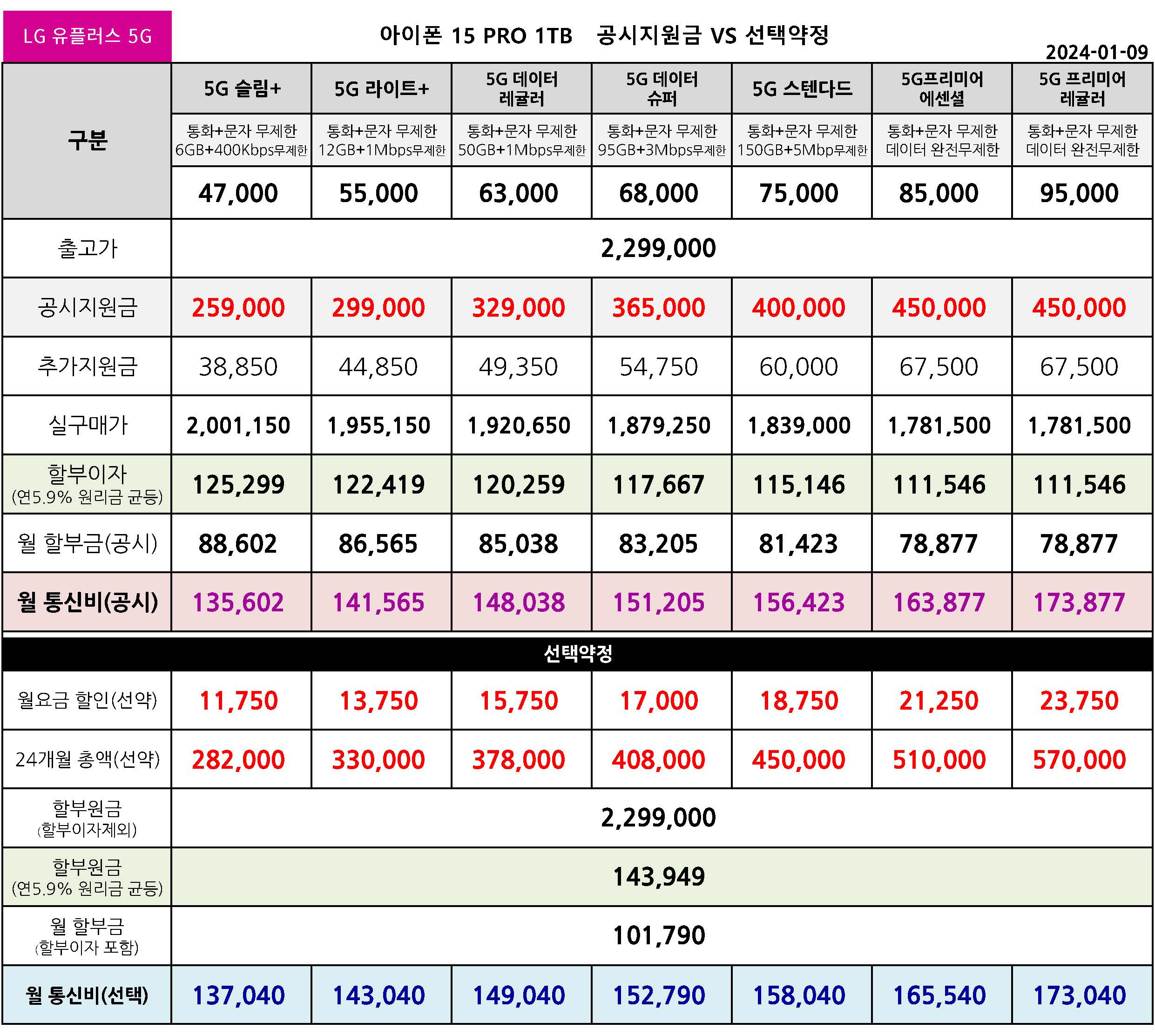 아이폰 15 프로 공시지원금 상승, 월 통신 요금표 - 1월 9일 기준