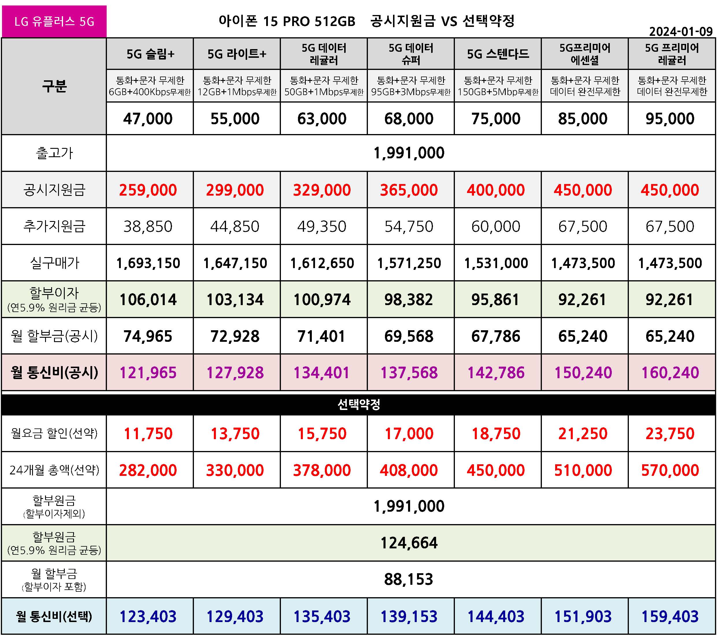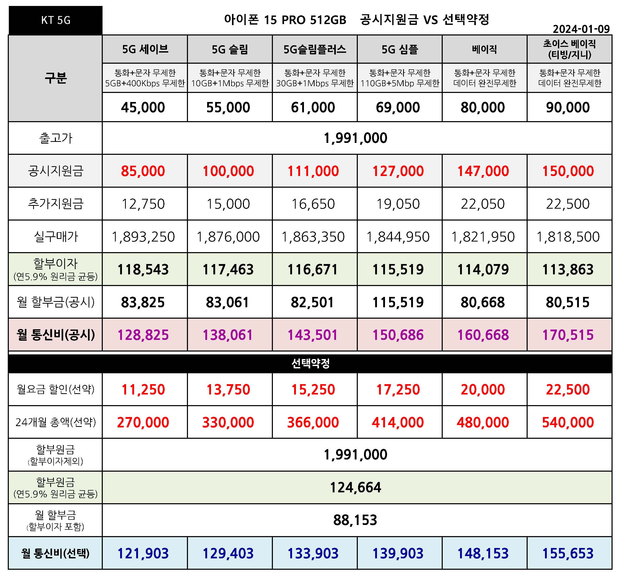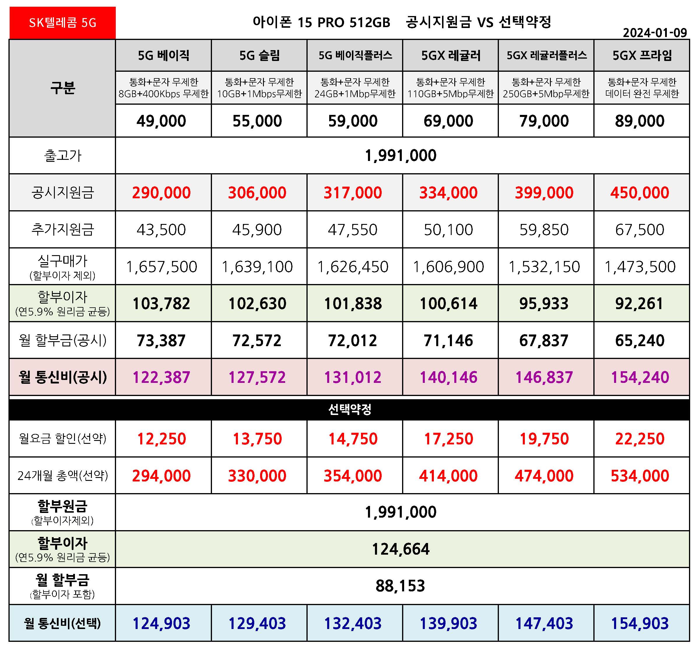 아이폰 15 프로 공시지원금 상승, 월 통신 요금표 - 1월 9일 기준