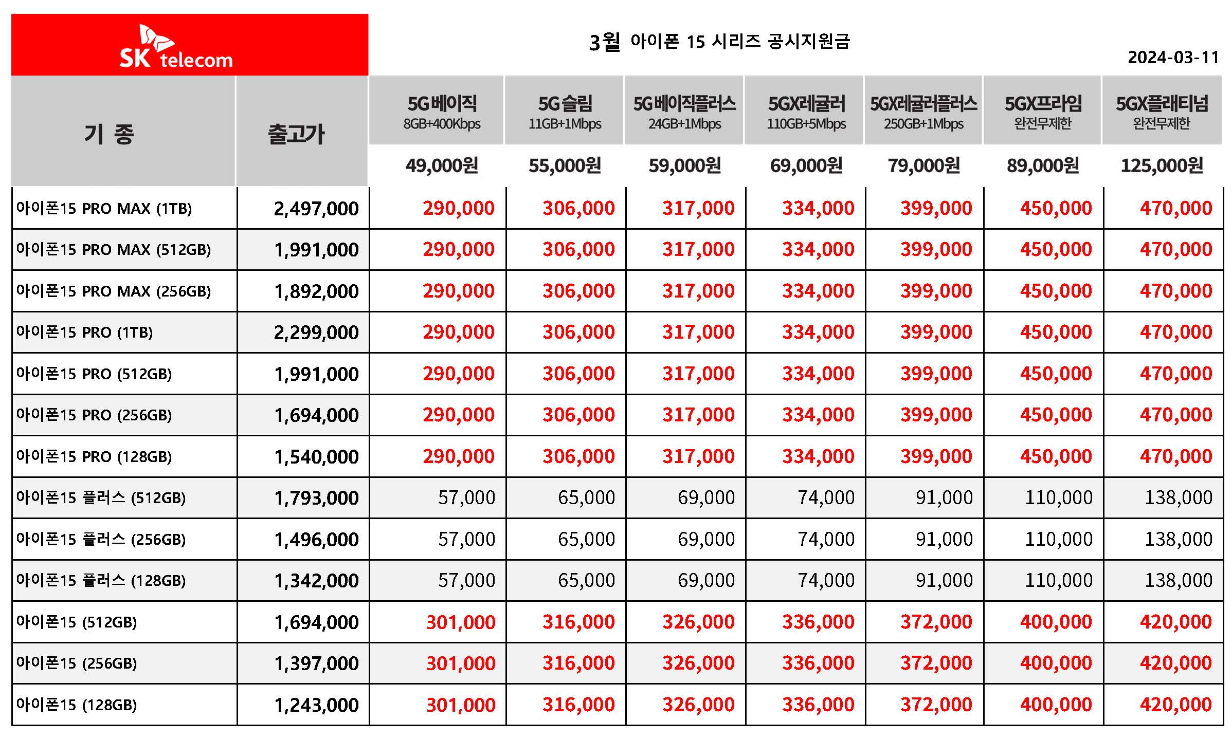 3월 SK텔레콤 아이폰 15 시리즈 공시지원금