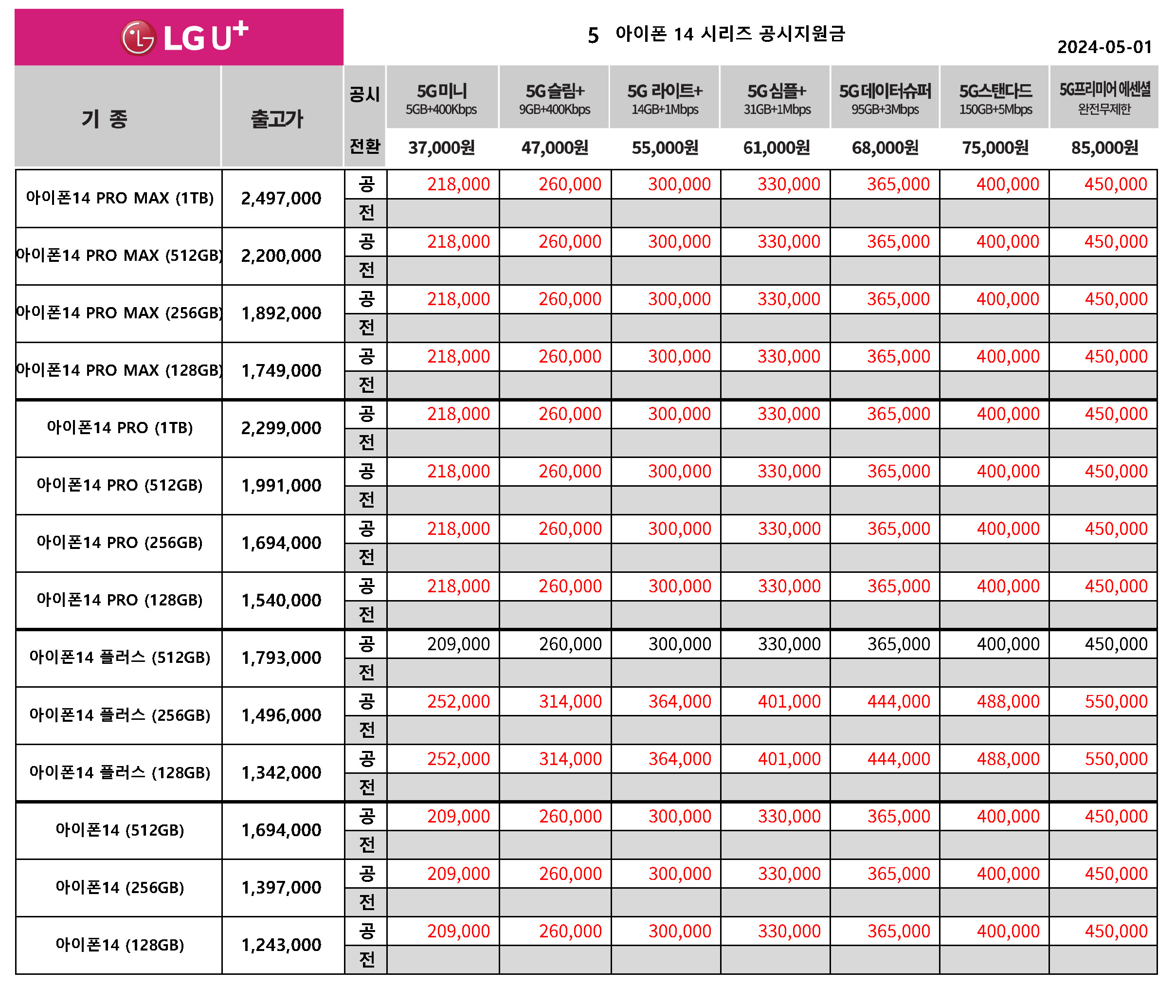 5월 LG 유플러스 아이폰 14 시리즈 공시지원금 & 전환지원금