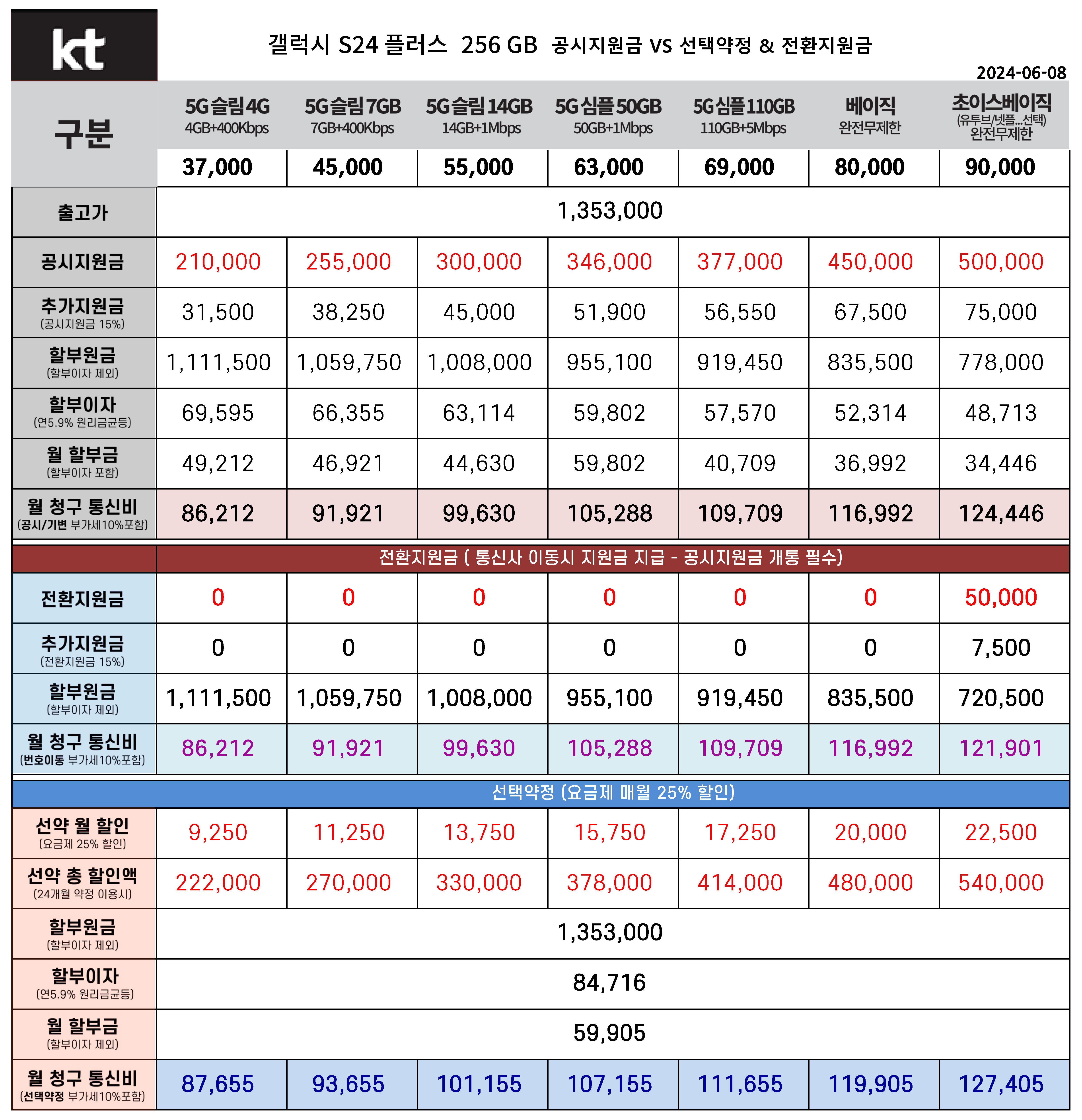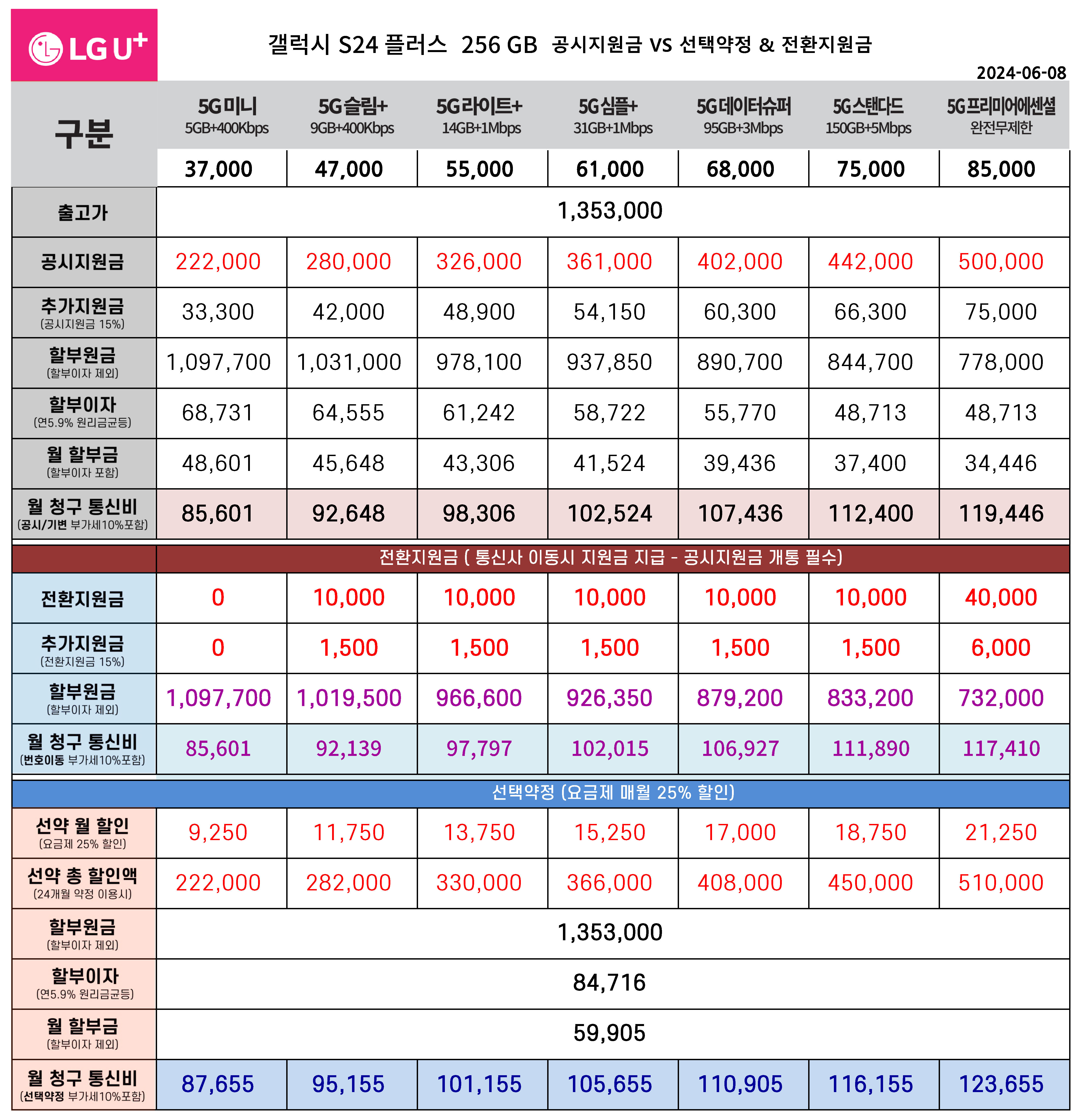 6월 갤럭시 S24 플러스 256GB (출고가 1,353,000원) 공시지원금, 전환지원금, 선택약정 월 통신요금표 ( 주요 요금제)