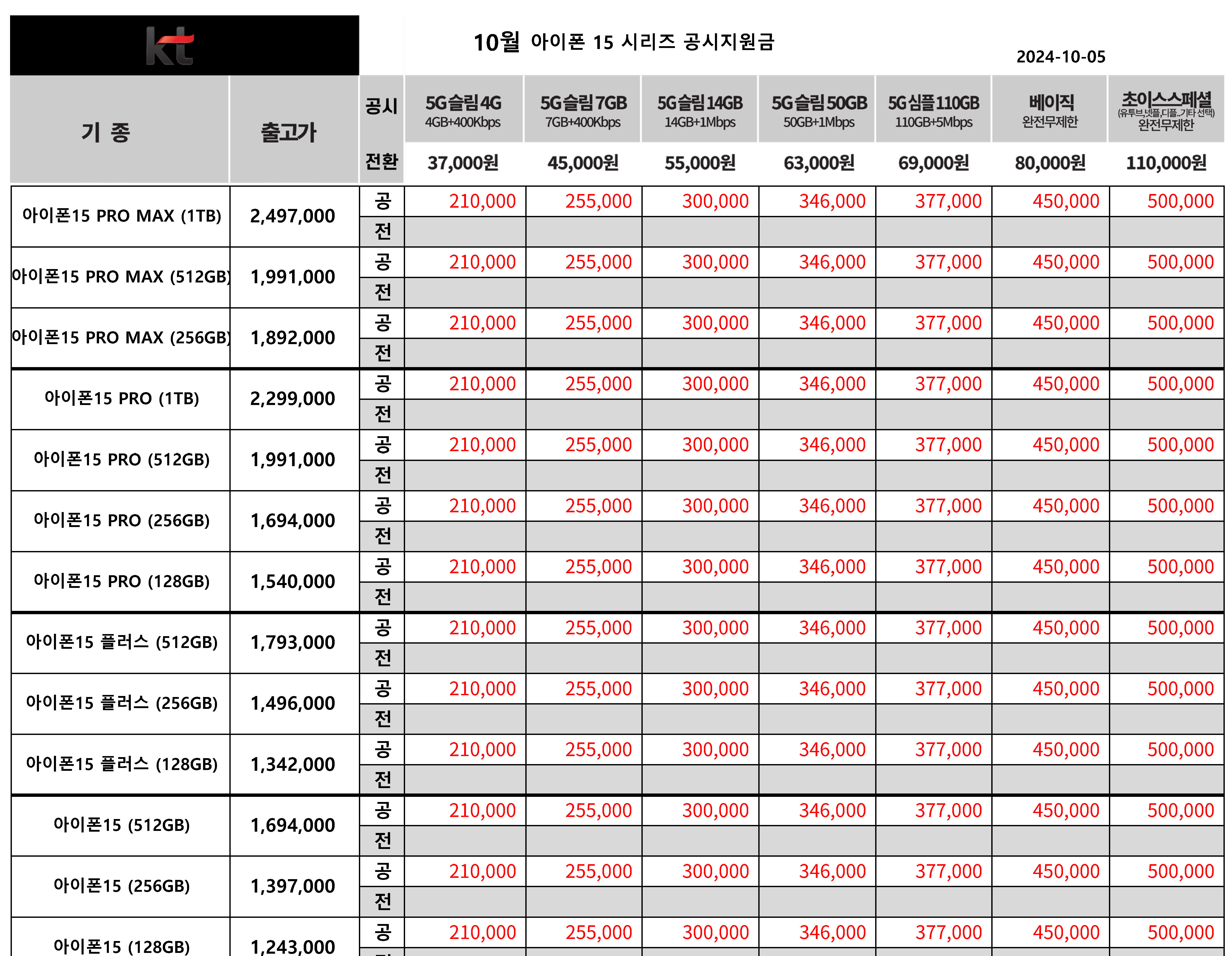 10월 KT 아이폰 16 시리즈 출고가 & 공시지원금 ( 아이폰 15 오타 입니다.. 죄송!!)