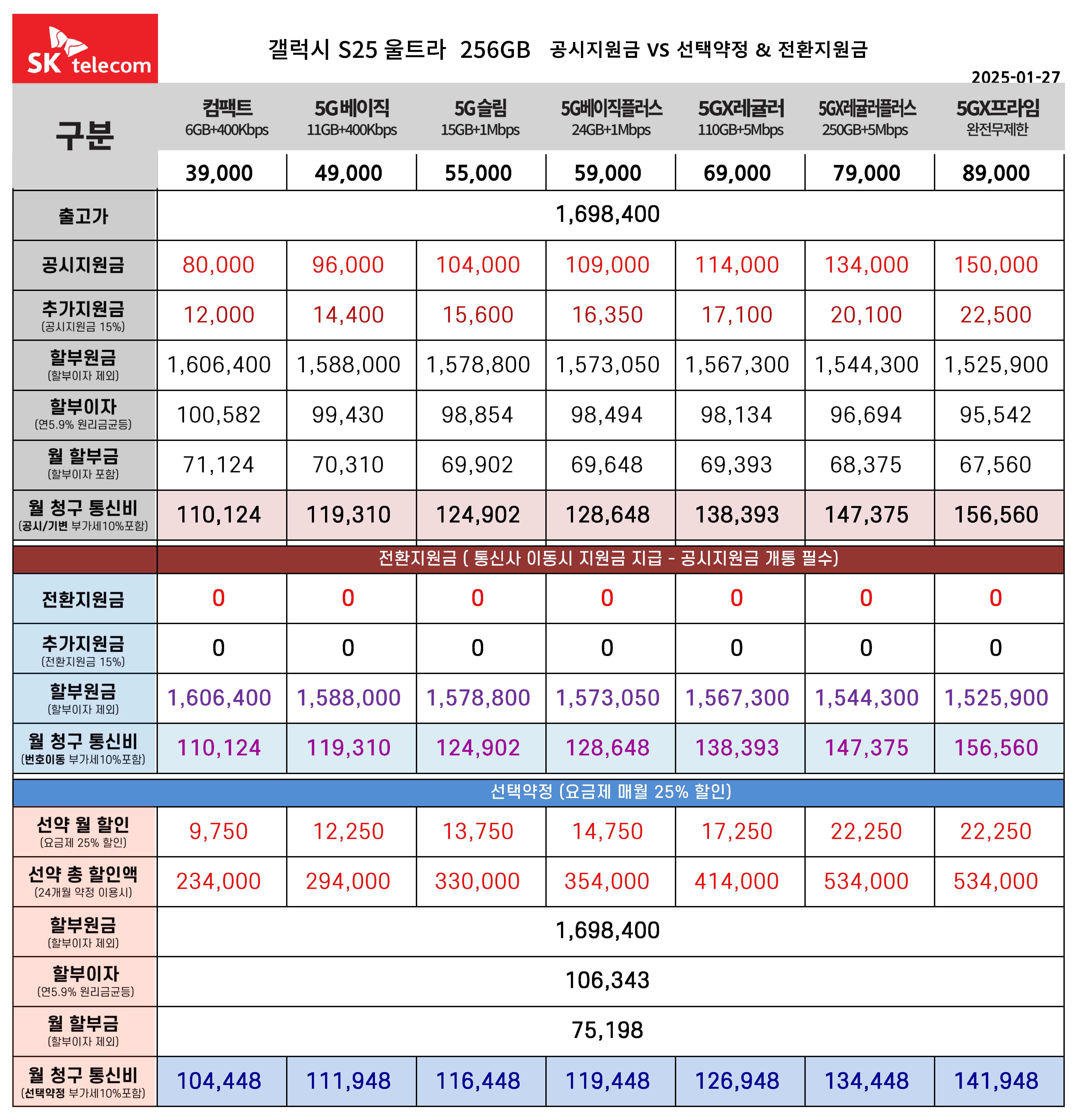 갤럭시 S25 256GB 공시지원금 & 선택약정 월 통신요금표