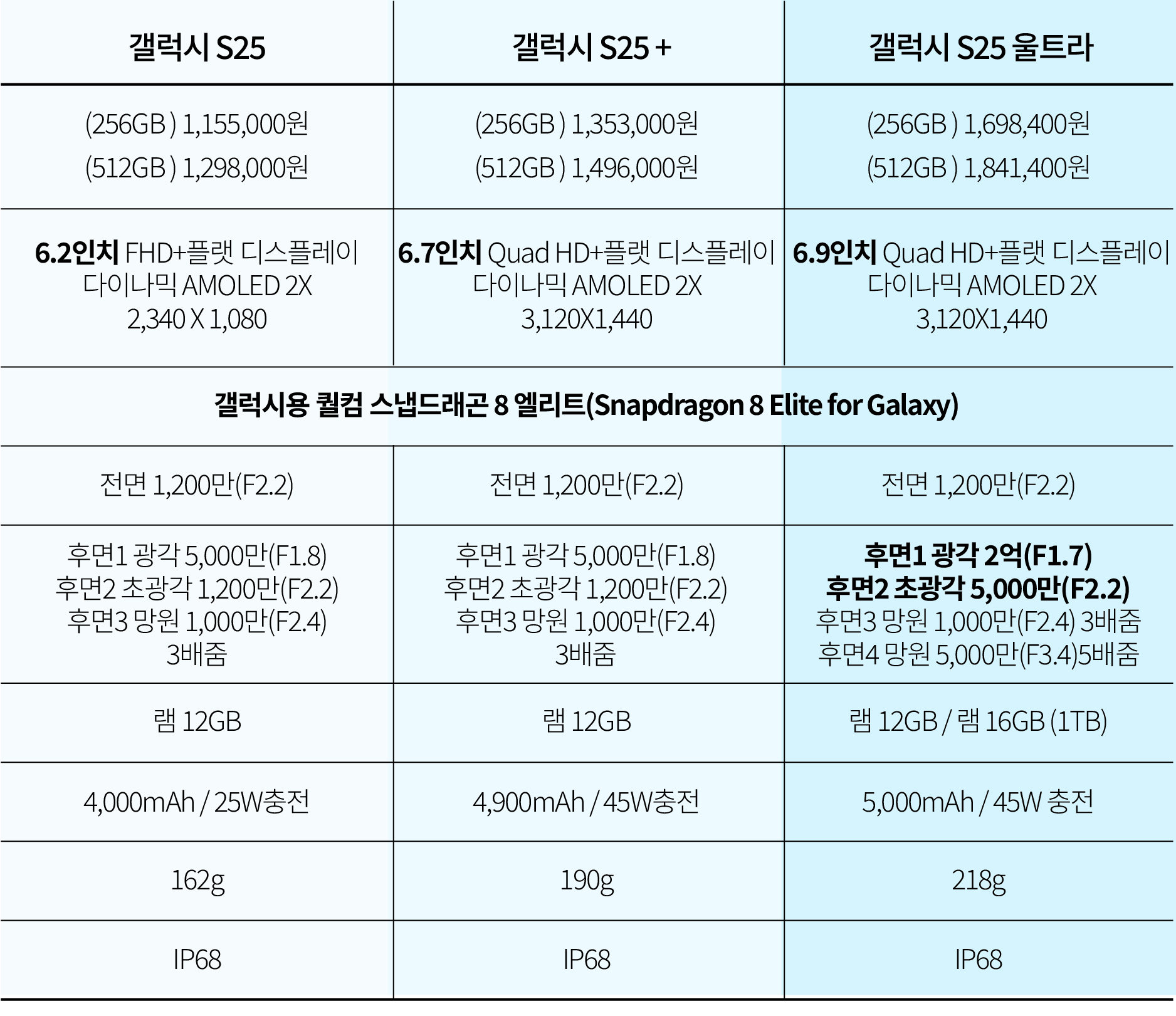 갤럭시 S25 VS 갤럭시 S25 플러스 VS 갤럭시 S25 울트라 기본스펙 비교표