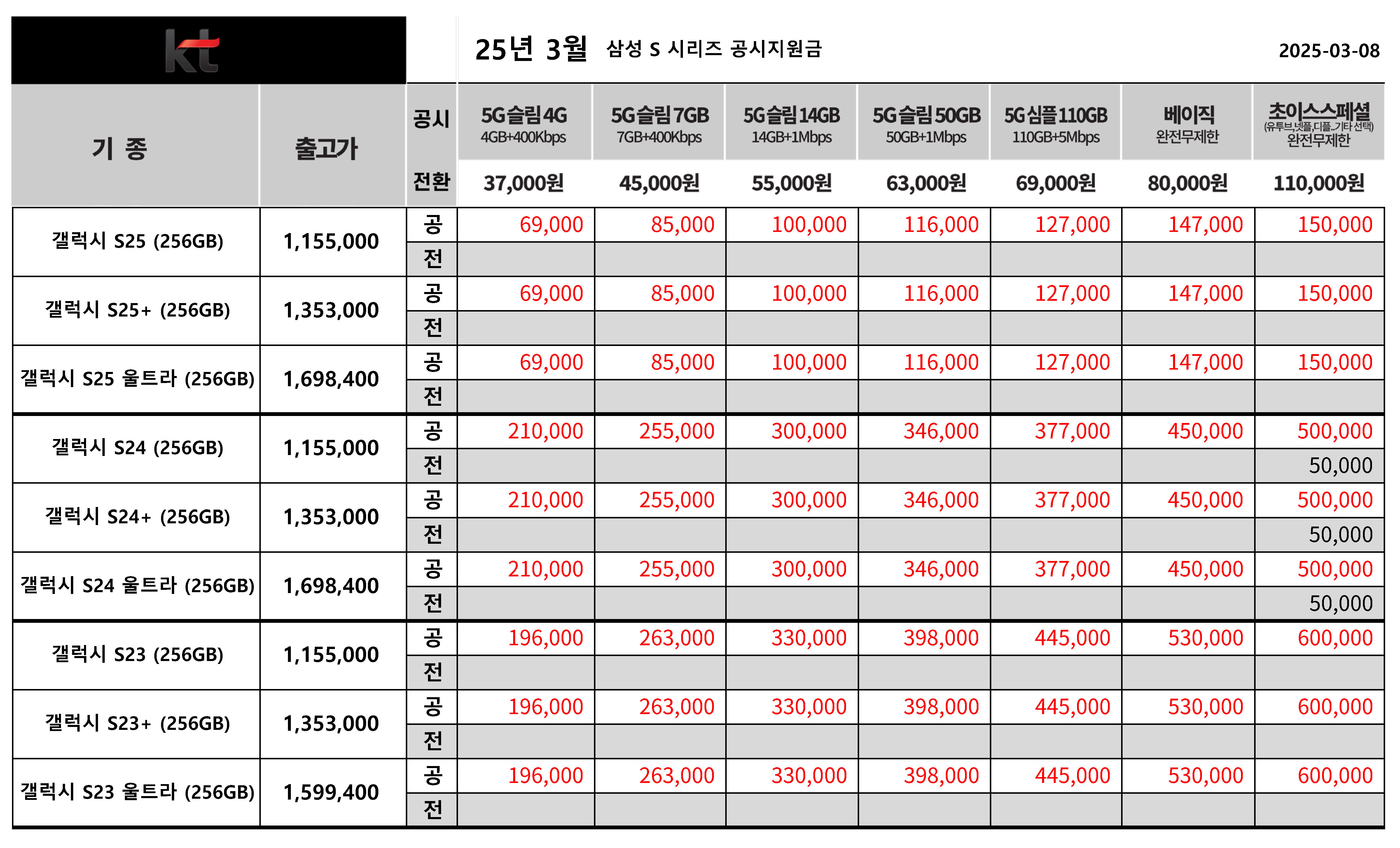 25년 3월 KT 갤럭시 S25, S24, S23 공시지원금 정리