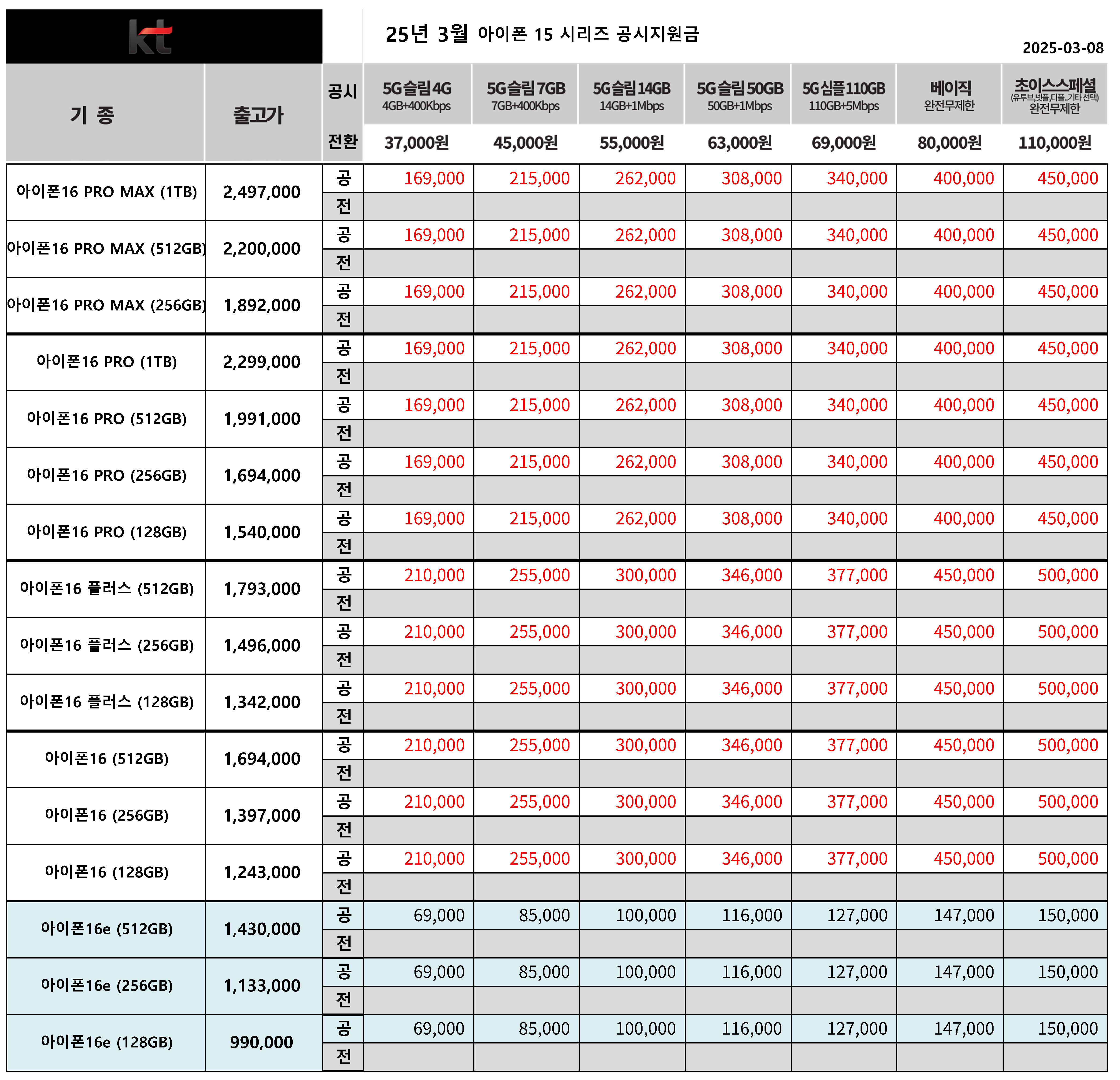25년 3월 KT 갤럭시 아이폰 16 시리즈 공시지원금 정리