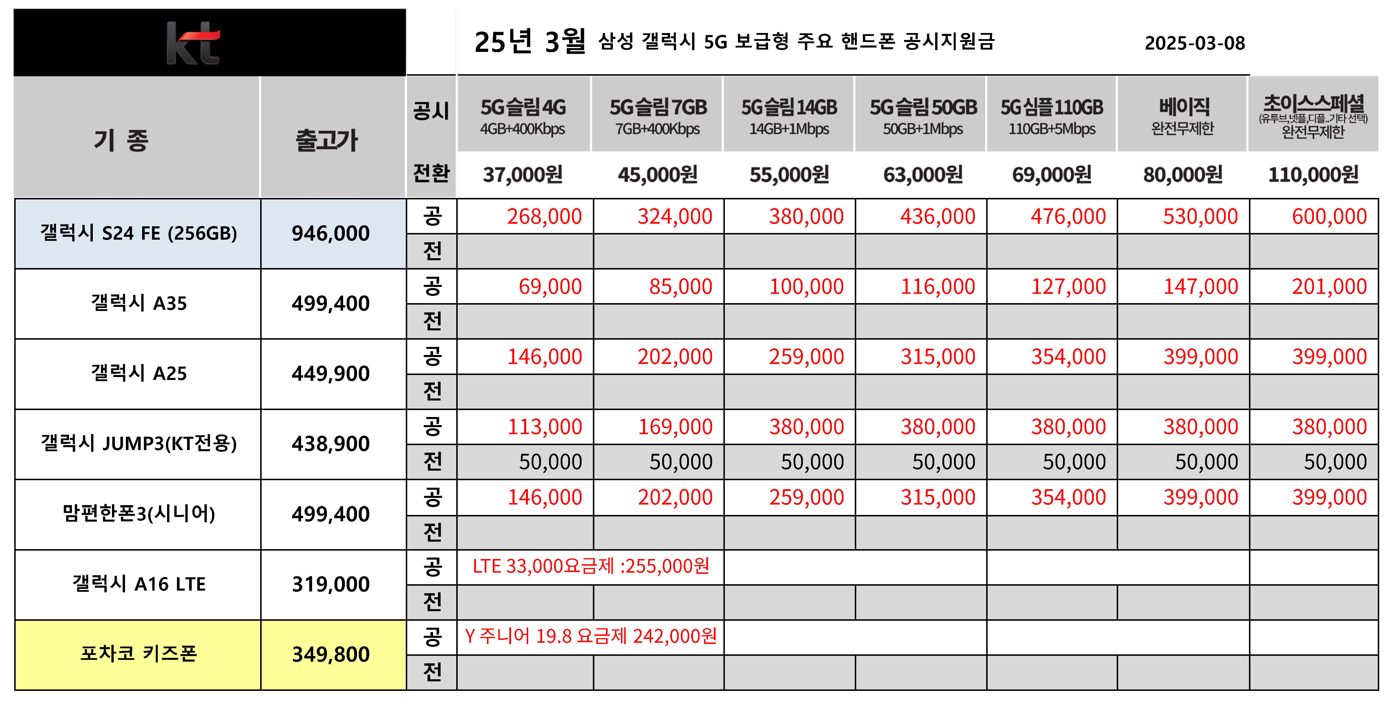 25년 3월 KT 갤럭시 보급형 휴대폰 공시지원금 정리