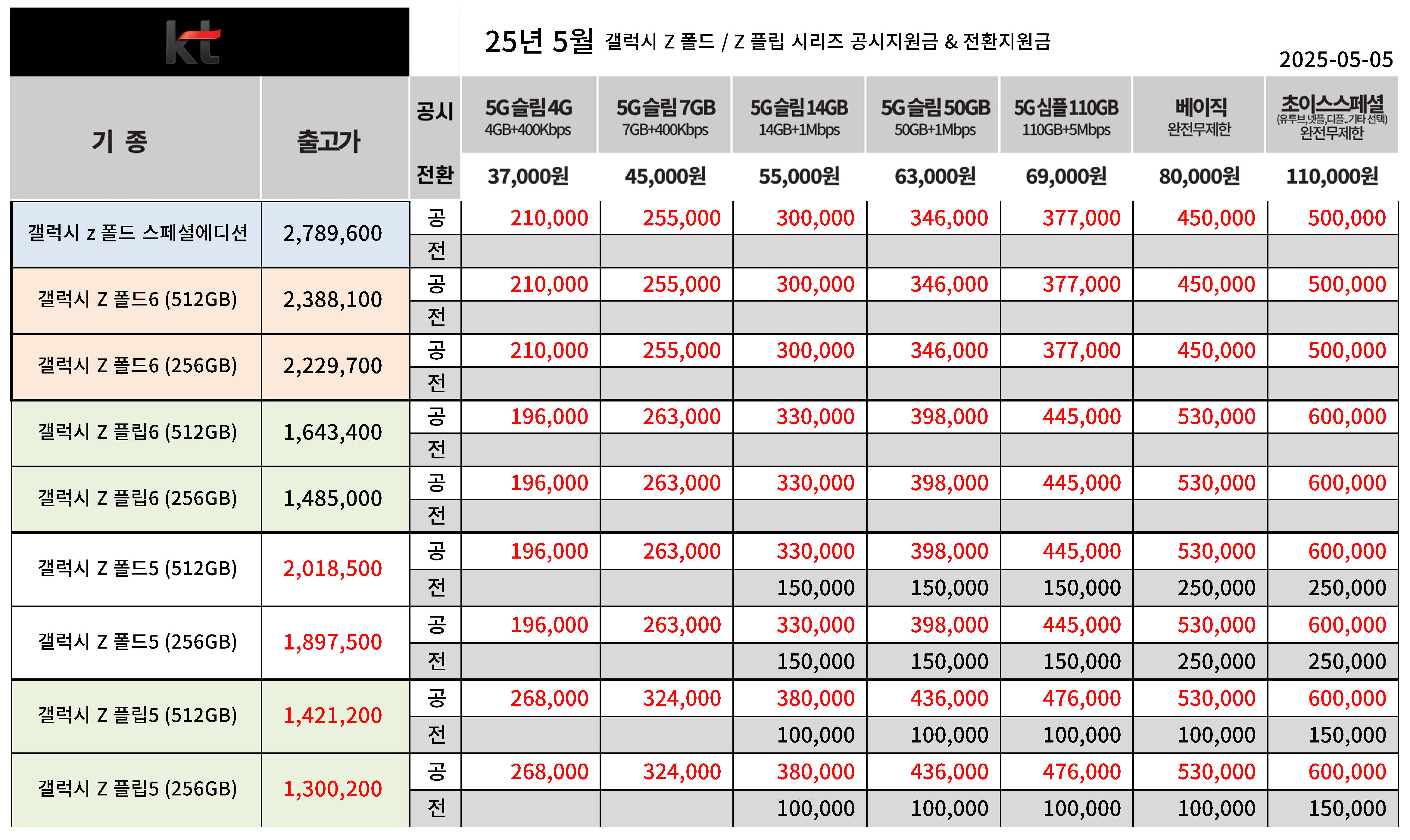 25년 5월 KT 주요 핸드폰 공시지원금 & 전환지원금 정리 포스팅 입니다.