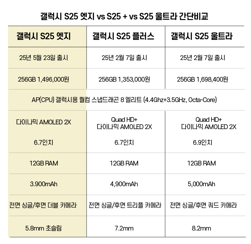 갤럭시 S25 엣지 VS 갤럭시 S25+ VS 갤럭시 S25 울트라 스펙 간단비교