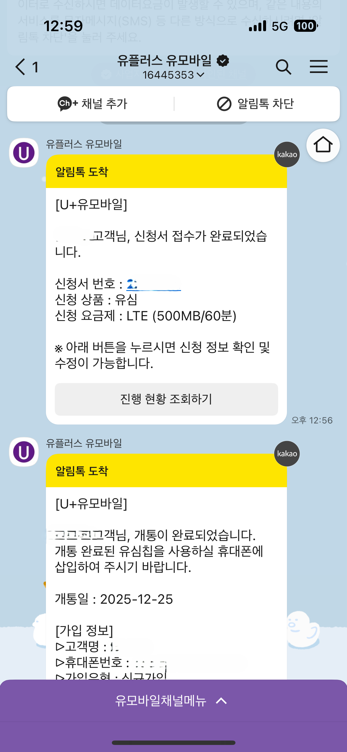 12시 56분에 신청 접수 안내 카카오 톡을 받고 바로 개통이 안되길레 진행사항 조회하고