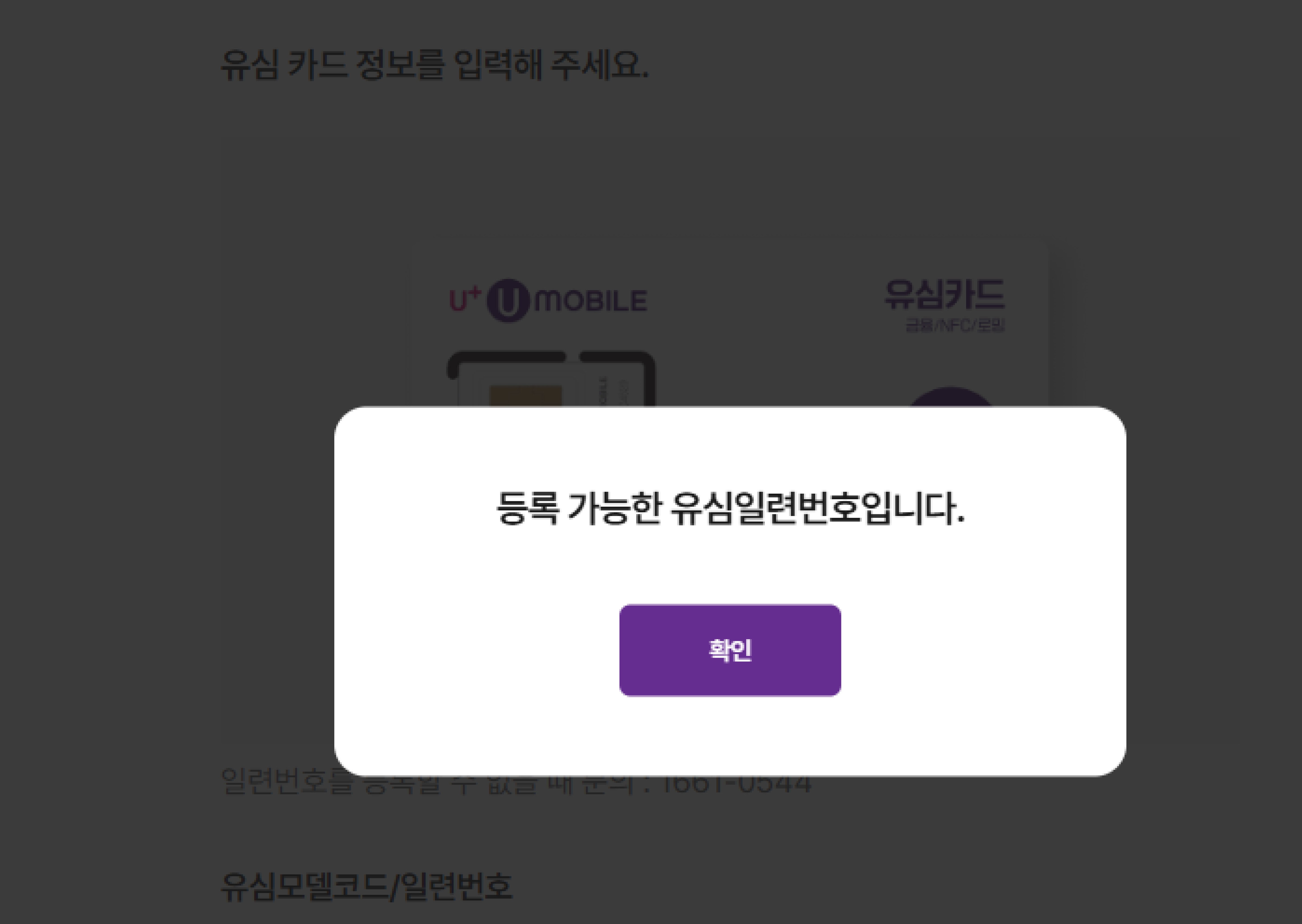 유심 모델 코드번호와 일련번호를 작성하여 유효한 유심인지를 재확인 합니다.