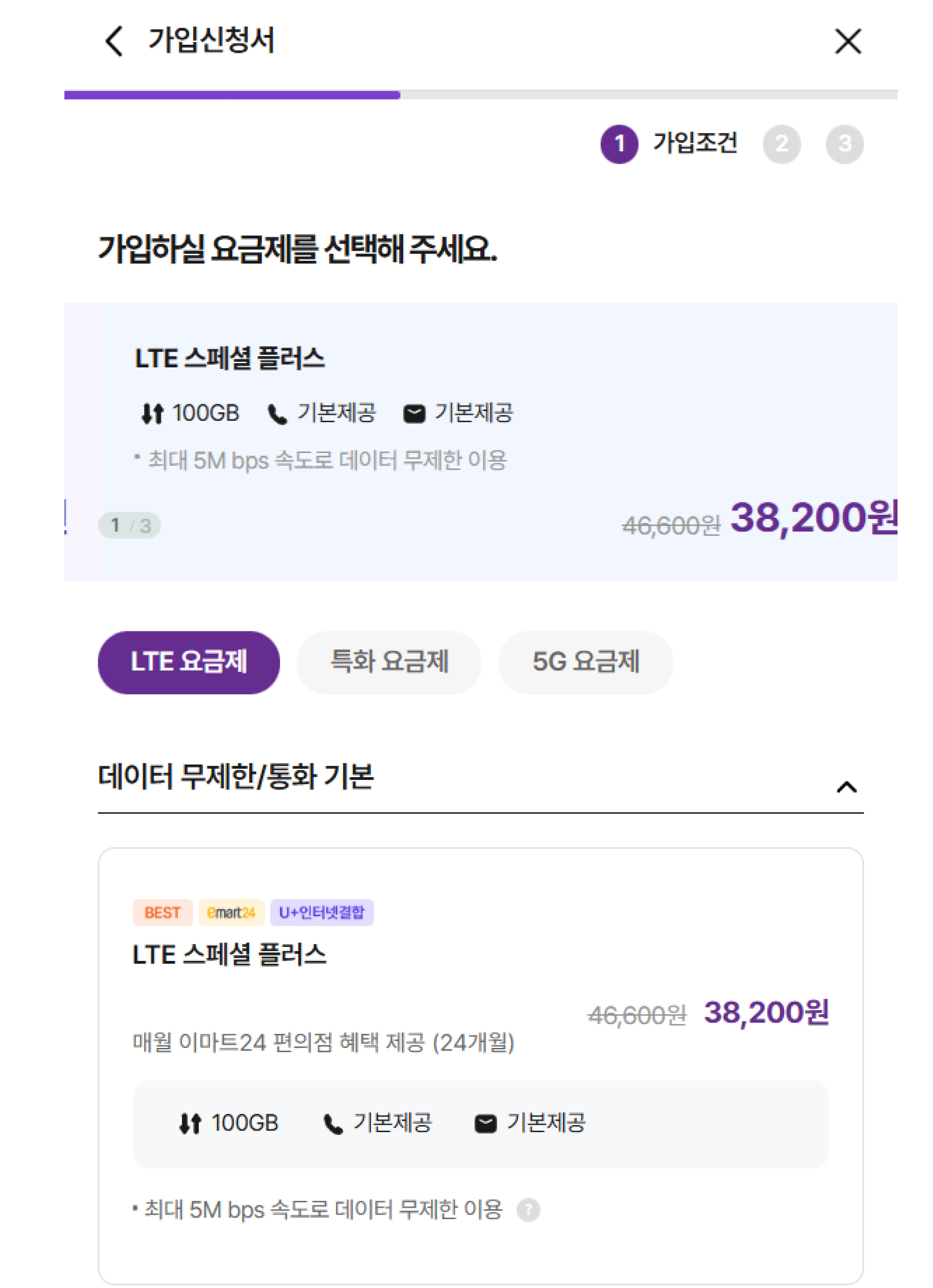 초알뜰 갓성비 요금제에서 3,300원 LTE 요금제를 선택할 수 있습니다.