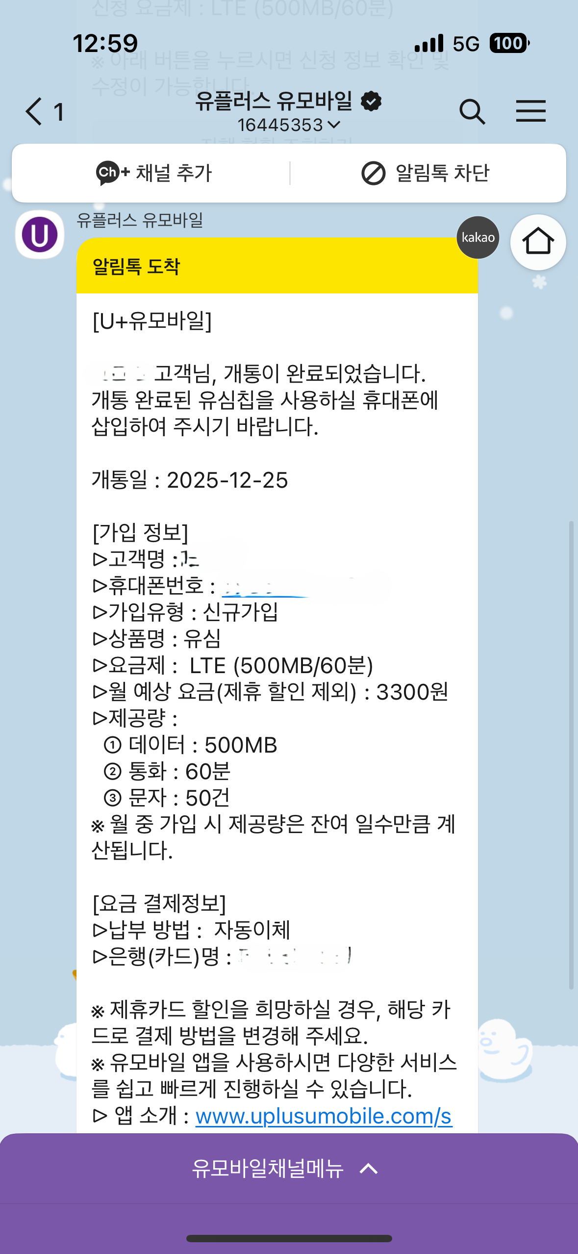11. 개통을 완료하면 아래와 같이 카카오톡이 전송됩니다.