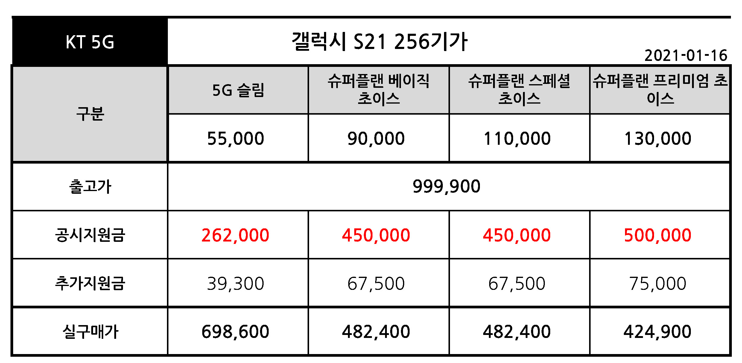 KT에서 부랴부랴 오늘(16일) 갤럭시 S21 공시지원금을 약 두배 상향조정 공시하였습니다.