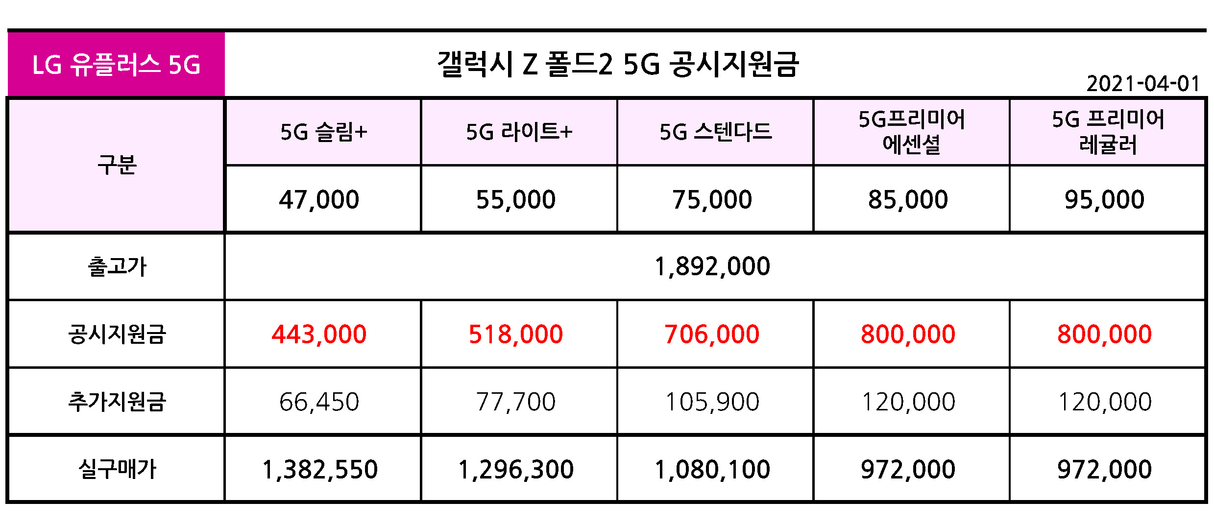 - LG 유플러스 갤럭시 Z 폴드2 공시지원금