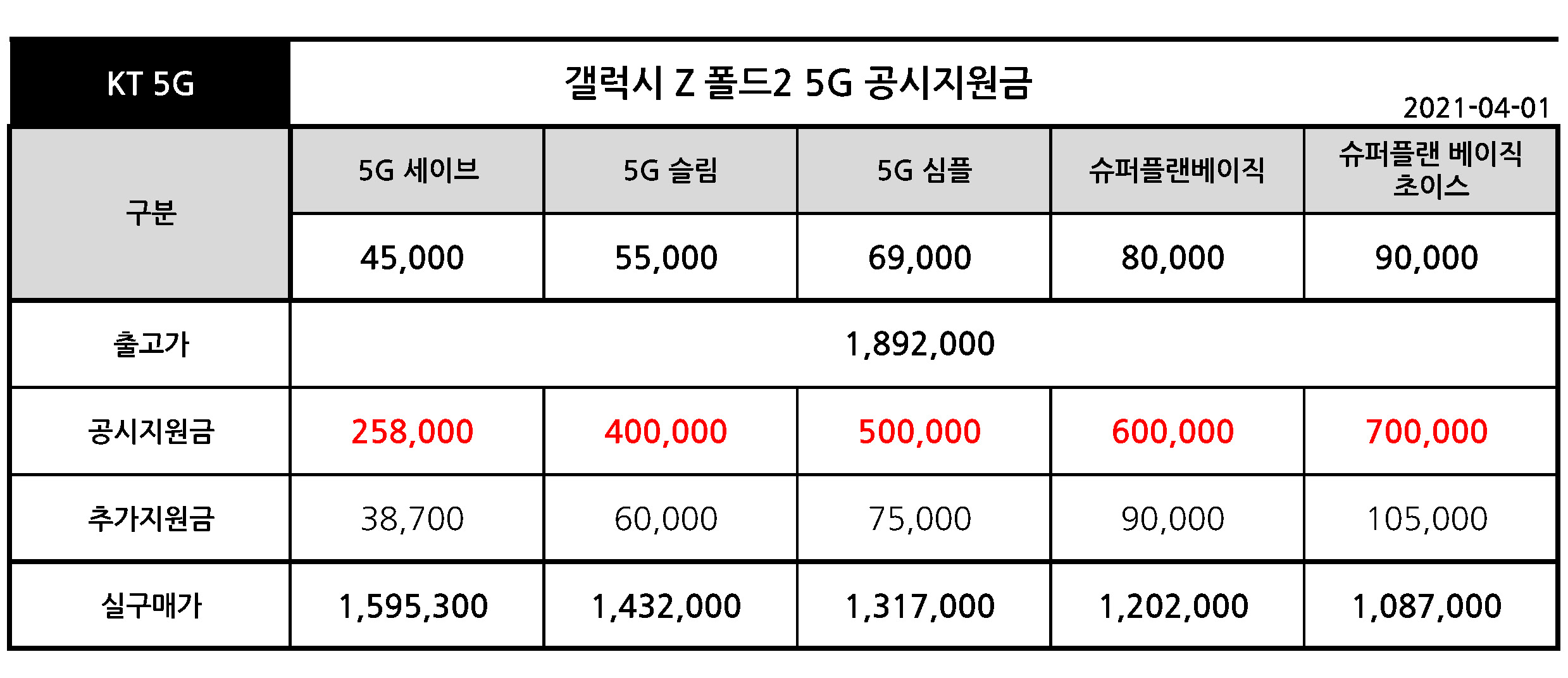 - SK텔레콤 갤럭시 Z 폴드2 공시지원금