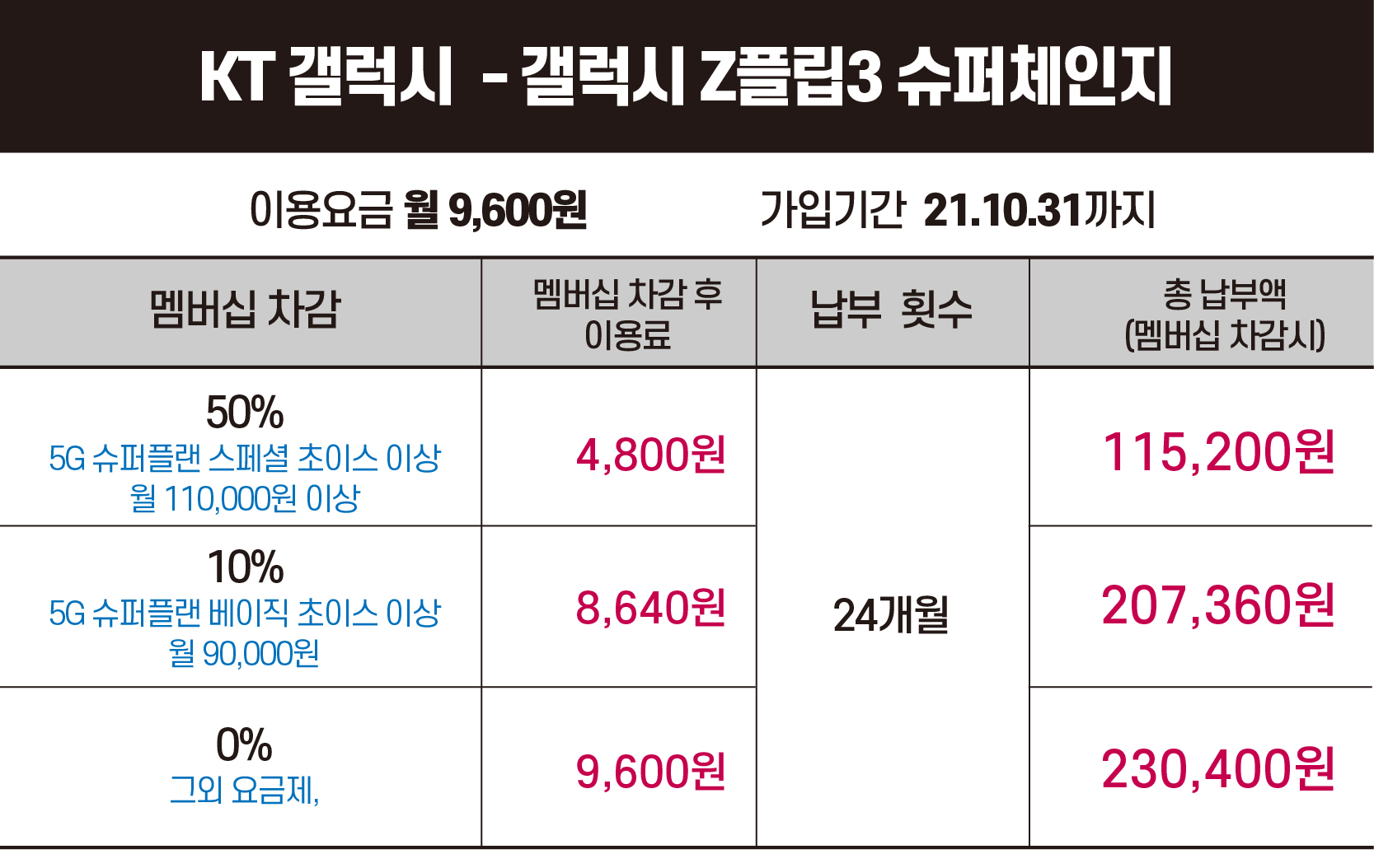 KT 갤럭시 Z플립3 슈퍼체인지 이용요금은 월 9,600원이며,